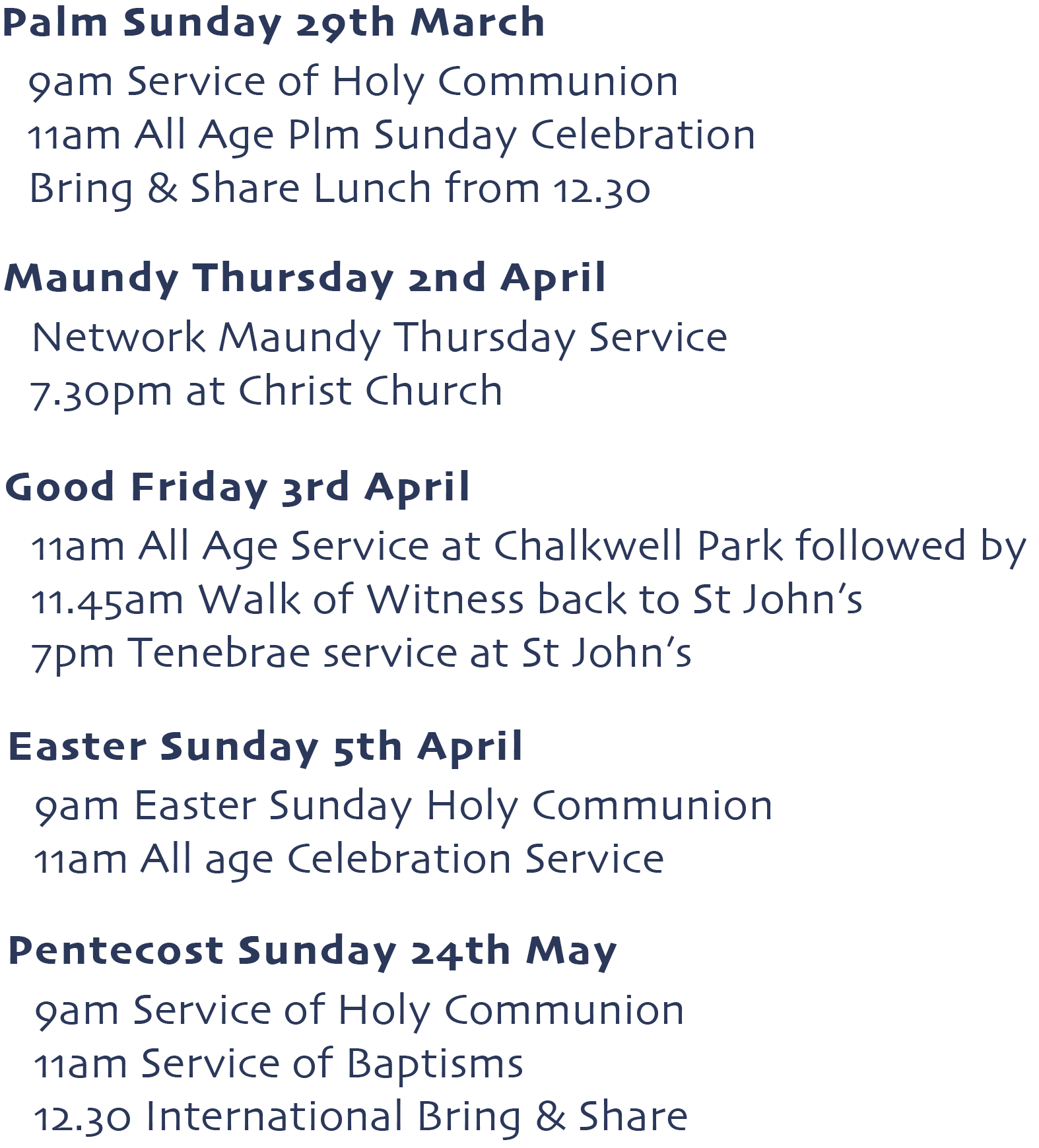 All our Sunday services will run as usual through Lent and Easter but the 5pm service on Easter Sunday is cancelled.